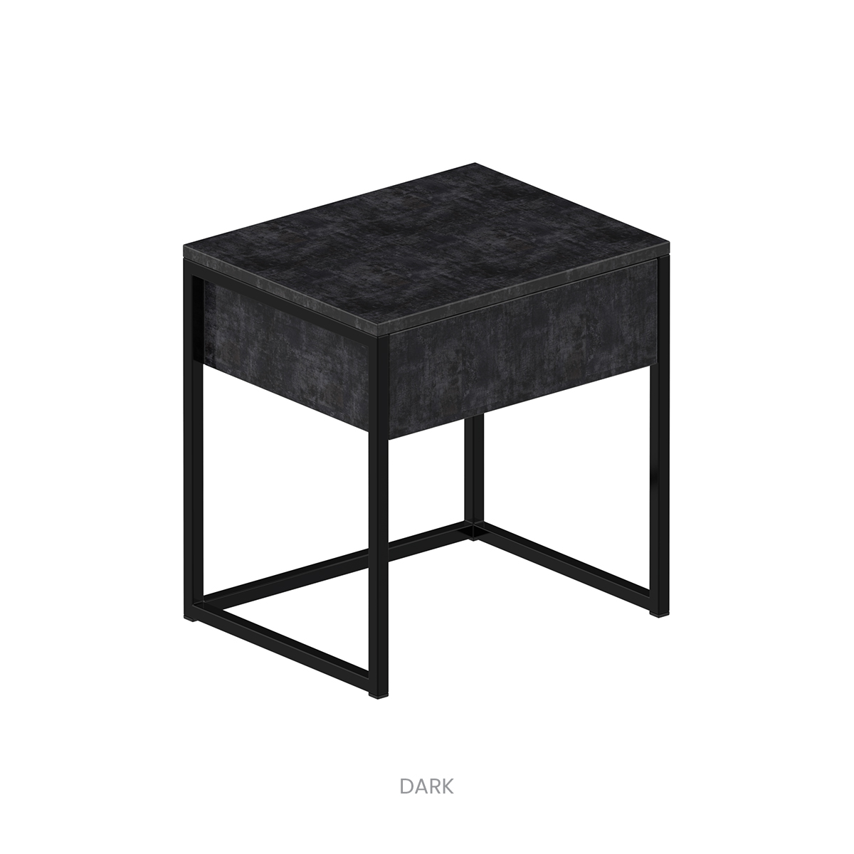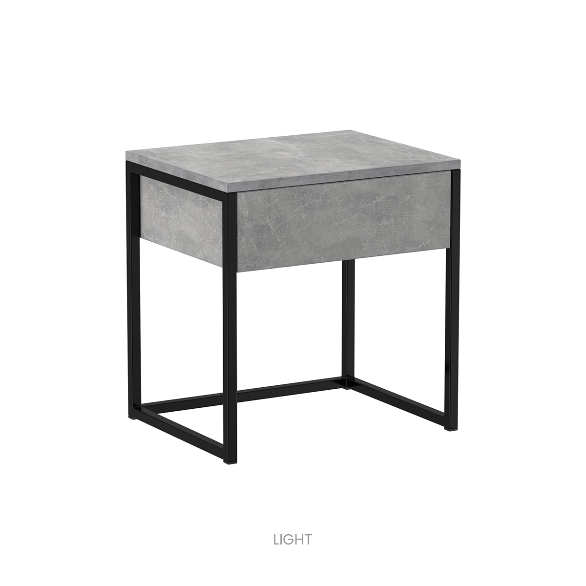 Diese Version lässt sich problemlos mit verschiedenen Polster- und Holzbetten kombinieren und eignet sich für moderne Schlafzimmer. Der Metallrahmen in Verbindung mit der Betonoberfläche (Dark / Light) verleiht ihm einen industriellen und zugleich zeitlosen Charakter. Als Teil der Kollektion bildet er ein harmonisches Ganzes und ermöglicht eine flexible Anordnung je nach den Anforderungen des Raums.